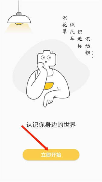 1. 开启智慧识物,进入应用界面,在界面上能够看到诸如“识花草”“识汽车”“识地标”“识动物”之类的说明,接着选择【立即开始】选项。