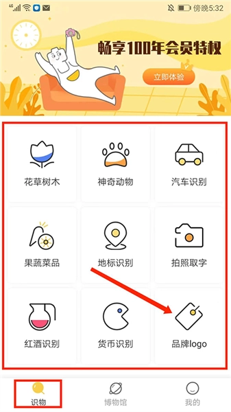 2、于【识物】界面,设有【花草树木】、【神奇动物】、【汽车识别】、【果蔬菜品】、【地标识别】、【品牌Logo】等功能选项。用户能够依据自身需求,挑选相应功能加以使用。在此,以【品牌Logo】为例,