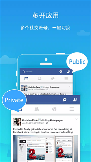 平行空间免root框架是一款可以实现手机应用、游戏无门槛双开的应用,在手机原有的系统基础上创建一个完全分离的空间,与手机的主系统之间的数据完全不互通,不管是root、修改手机配置,都不会影响到手机的正常使用。可以实现QQ、微信等社交软件的双开,实现一部手机可以同时登陆多个社交账号,通过切换空间切换登录的账号,工作生活两不误。