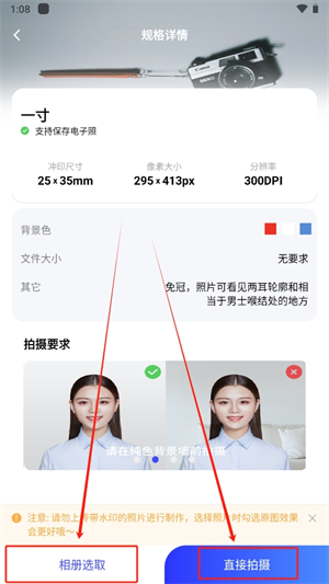 4、然后点击最下方的【相册选取】选择拍摄好的证件照,或者【直接拍摄】现场拍照开始制作;