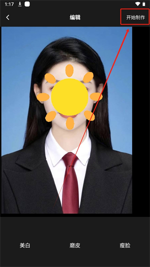 5、编辑你的证件照,可以进行美白、磨皮、瘦脸等操作,编辑好后点击右上角【开始制作】;