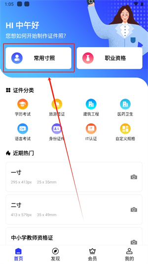 2、在首页选择你需要制作的证件照,也可直接点击【常用寸照】开始制作;