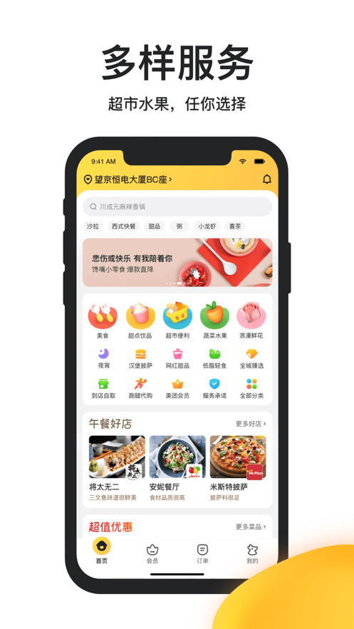 美团外卖随时都可以点外卖,附近商家折扣优惠第一时间为用户推送,每天更有红包等你来抢。