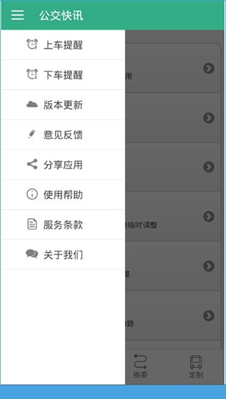 5、在软件主页上点击左上角的更多即可进行设置上车提醒或下车提醒的闹钟,同时还可以分享应用等。