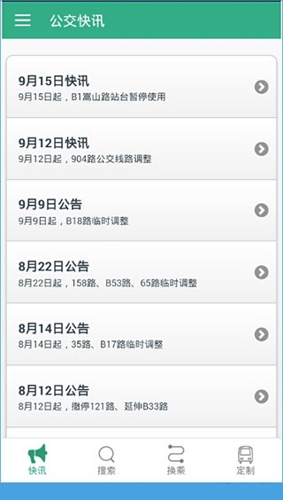 1、打开主界面,即看到公交快讯页面,用户在这个页面中可以了解最新的公交线路调整或暂时停用的一些信息;