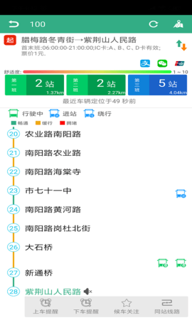 4、“车内舒适度”提示:候车界面车辆位置信息、车辆预到站时间一应俱全,更有全国首创“车内舒适度”提示,依据车内客流统计设备换算出车内舒适度指数,用红、黄、绿不同颜色显示,方便市民选择出行车辆。