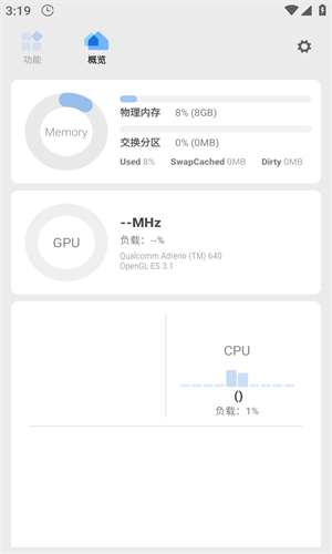 而在概览模块中,用户可以查看手机的物理内存,CPU运行,手机电量、温度、型号以及开机多长时间等信息。