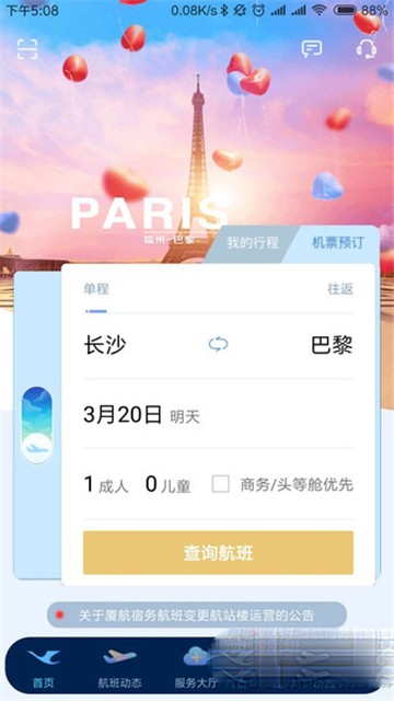 厦门航空app是厦门航空官方旗下的航空旅行服务平台,以其全面的服务功能成为了旅客出行的得力助手。软件提供了机票预订、改签、值机选座、自助退票、订单查询等基础功能,线下推出了机票验证、乘机证明等贴心服务,让旅客的出行更加安全便捷。更要特色机场接送服务,享受到从家门到机场的无缝对接,省去了繁琐的交通安排,让旅途更加轻松愉快。