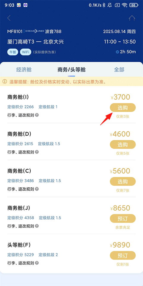 1、打开厦门航空APP官方版,在首页搜索选择出发地和目的地,点击【立即预定】。