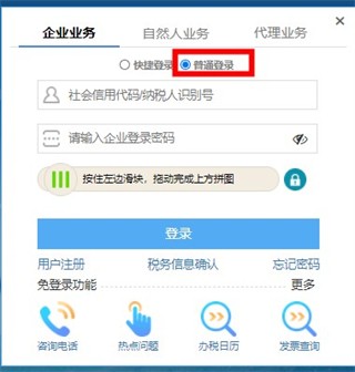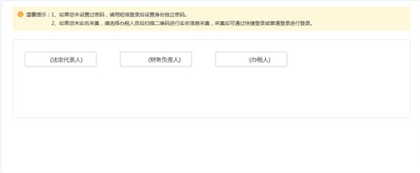 =普通登录:通过输入社会信用代码/纳税人识别号、企业密码、验证码后登录进选择身份界面。
