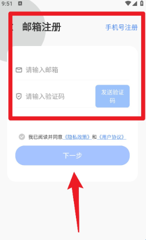 1、打开 App后进入邮箱注册页,输入邮箱地址并点击“发送验证码”,收到后填入验证码并点击“下一步”。