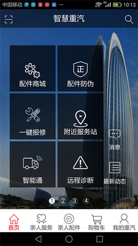 智慧重汽,我的重汽;配件商城,服务点查询,二手车交易,服务预约,典型车辆案例,品牌商品,汽车金融服务,智能车辆监控,一键报修,为您打造更贴心的智慧重汽。