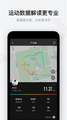 支持记录运动后的数据展示,可以查看详细轨迹及各种运动数据的指标分析;