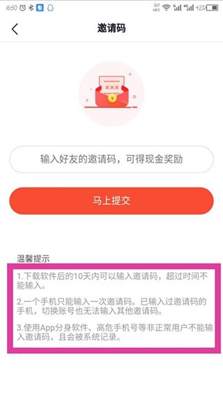 4、能看到下面的温馨提示,需要符合要求,才可以输入邀请码获得奖励;