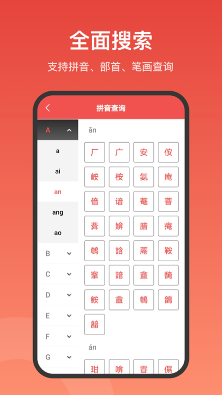 1、支持多种搜索方法,如汉字、拼音、部首、笔画等。