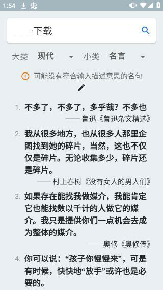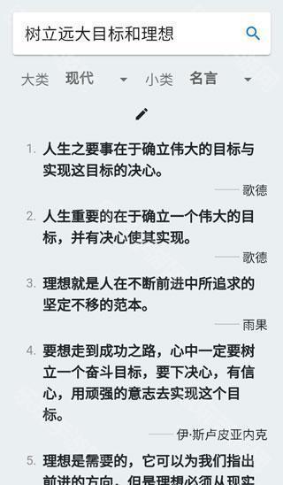 3、如在搜索框中输入“树立远大目标和理想”,在“大类”中选择“现代”,“小类”中选择名言,进行搜索后可以得到歌德、雨果、鲁迅等国内外名人关于“目标”和“理想”的名言。