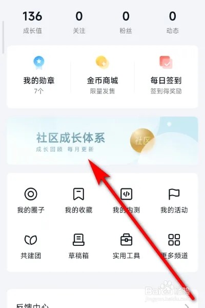 1、在软件的个人中心界面选择【社区成长体系】,点击打开。