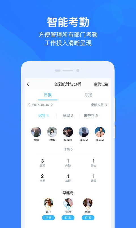 4、签到:多种签到方式精准定位;智能管理内外考勤,统计工时、迟到早退请假等状态。