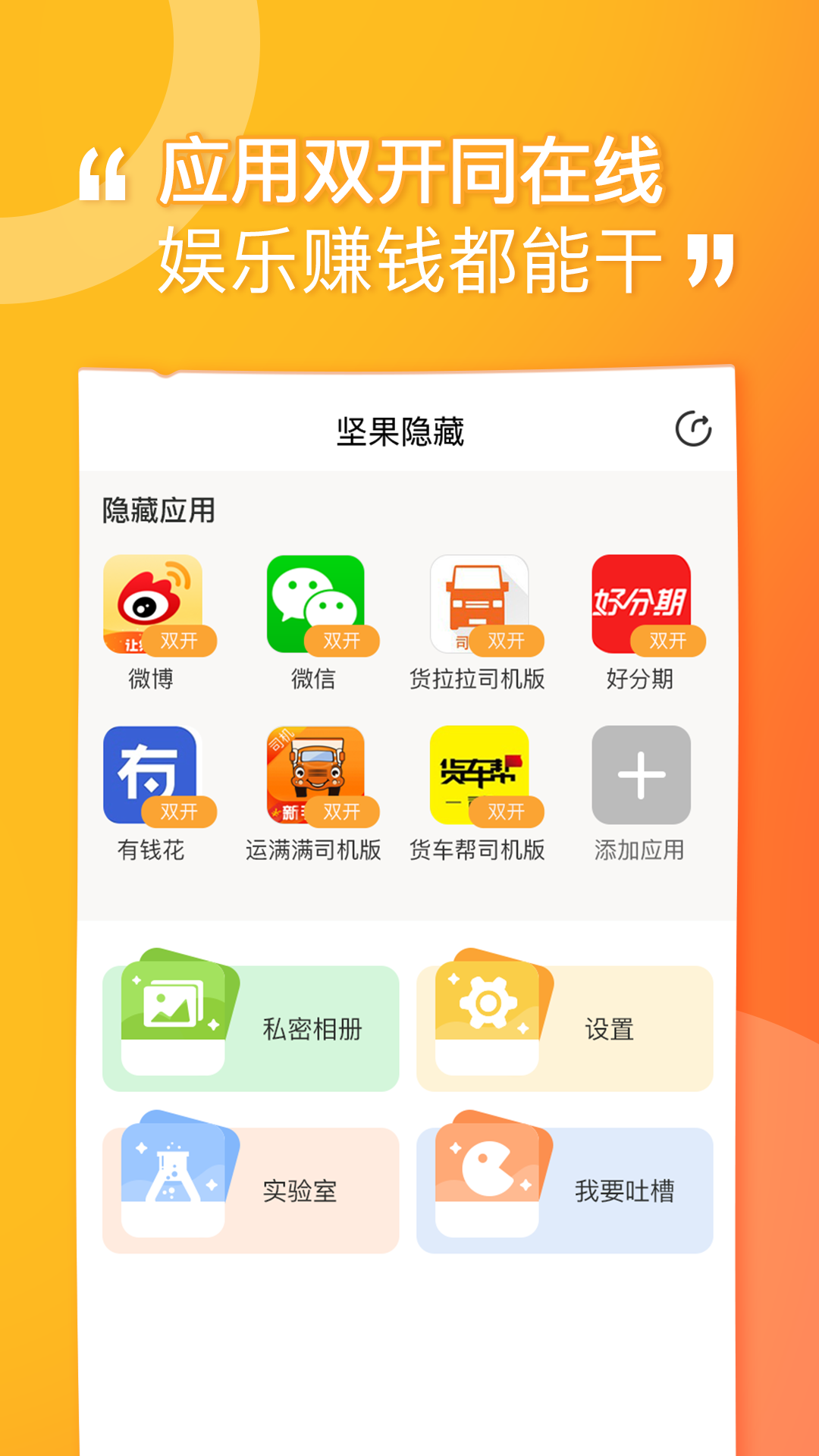 2、应用隐藏——陌陌隐藏,搜索隐藏,微信应用隐藏,直播软件隐藏,图标隐藏,任何你不喜欢的应用,你都能隐藏,你永远不用担心别人翻看你的手机。