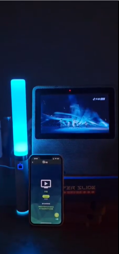 4、同时开启另一个观看Dou Yin直播用的播放装置,当演唱会节目开始,APP与荧光棒/夜灯即同步进入云端互动模式,享受与线上演唱会影片同频率的声光互动。