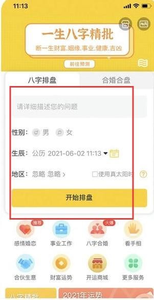 1、常用求测界面,提供八字精批、合婚排盘等服务,填信息可开始排盘,有情感、事业等分类。