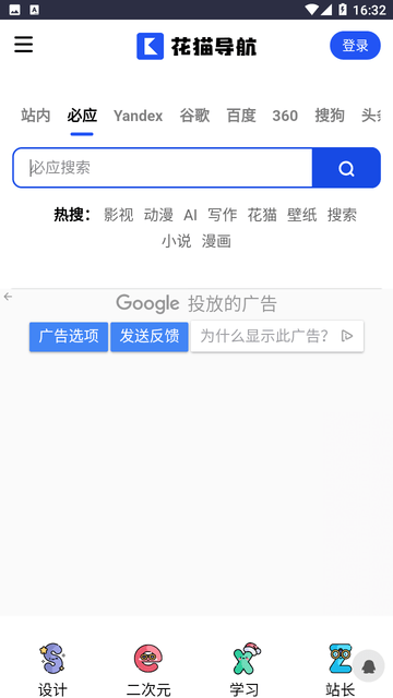 多功能综合:花猫导航APP集成了搜索引擎、AI工具、动漫、影视等多种功能,满足用户不同需求。