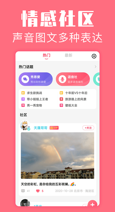 恋爱空间app,专为恋爱中的情侣打造的全新社区交友软件!它能帮你记录情侣间的点点滴滴,大小事一个不落。用户可自由创建各类纪念日日期,为爱情留下专属印记。还能精心装扮两人的专属空间,增添浪漫氛围。更有一键分享功能,能将甜蜜瞬间分享到朋友圈、空间微博,让好友一同感受你们的幸福,快来开启属于你们的恋爱记录之旅吧!