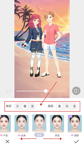 之后用户可以左右滑动下方AI美颜,有自然、御姐等多种多样的美颜效果可以进行选择,上方还可以调节美颜的轻重度,小编建议轻度,这样就可以看起来更自然一点,选择完点击右下角的勾就可以一键美颜啦!