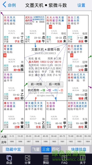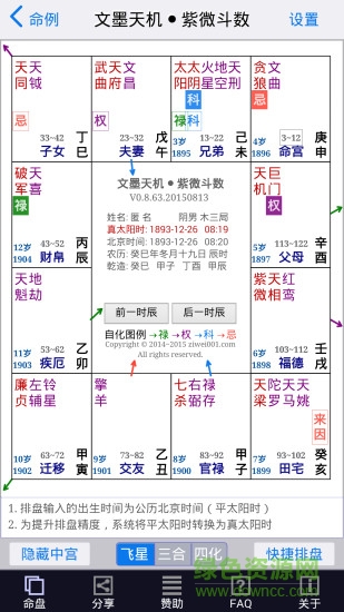 3、提供精心设计的排盘介面,风格简约而不简单,相容命理师和紫微斗数爱好者的既有使用习惯,盘面布局和配色风格与使用广泛的飞星、三合、四化排盘软体保持一致,大幅降低使用门槛。