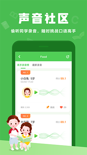 1、系统智能评分,实时的监测孩子英语口音检查,时刻了解学习英语的成果。