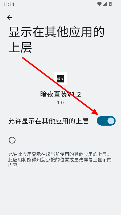 下载安装暗夜直装V1.2,之后打开,点击开启悬浮窗权限;