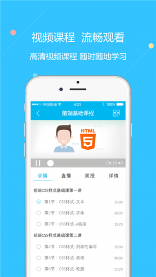 4、海量课程,高清视频课程,流畅观看,随时随地学习,真人直播教学、在线互动、万人同时在线、便捷的个人中心,有效学习