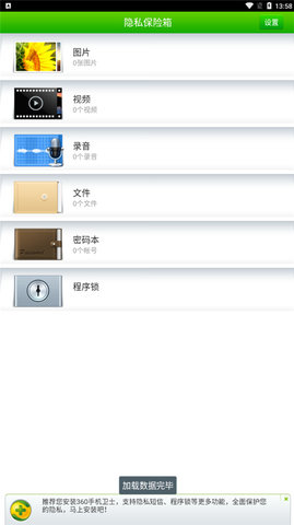 想保护手机隐私?360隐私保险箱App官方版别错过!它由北京奇虎科技有限公司专为手机用户打造,完全免费。拥有强大加密系统,安全性能极高。支持图片、视频、录音、文件、密码本、程序锁6大功能。只需把需加密的图片、视频等放入其中,就能轻松实现隐私保护。让你的个人隐私得到全方位守护,放心使用手机,无惧隐私泄露风险。
