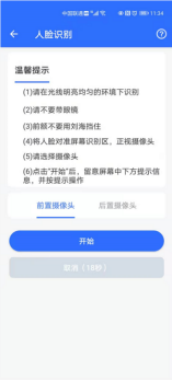 3、根据系统提示,选择“前置摄像头”或“后置摄像头”,点击“开始” 进入人脸识别页面,然后根据系统界面提示完成“人脸识别认证”即可。提示即认证成功。