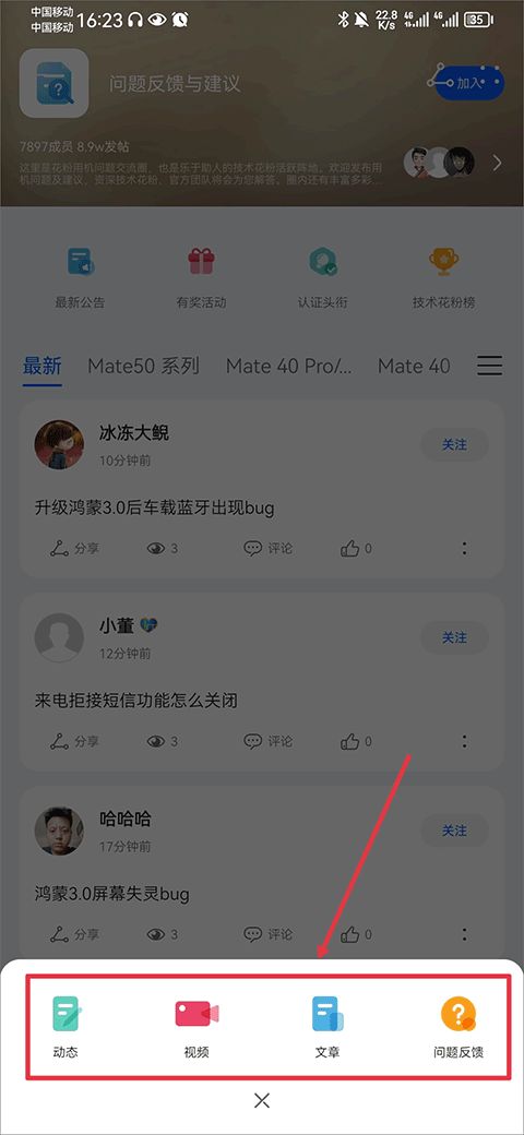 3、然后在下方动态、视频、文章、问题反馈中选择一个你喜欢的方式进行发布