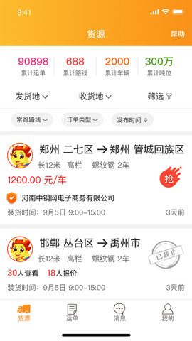 运单页面:可以查看到自己跑的路线的情况;还能看到自己的抢单和竞价情况。