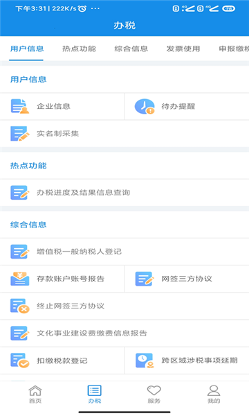 办税指南助您了解办税流程和所需资料等;大厅实况让您实景查看各办税厅排队情况,避开拥堵高峰;进度结果让您快速查看税费事项办理进度,也可扫描查看电子缴款凭证信息;征期日历提供每月征期查询;帮您算税为您计算有关税费缴纳信息;纳税信息方便您随时查看税费缴纳情况;发票真伪提供发票代码(号码)、查询码、二维码查询服务,可查出发票的详细信息,维护消费者权益;我的下载:常用涉税费文书和操作指南等文档的查阅和软件下载。