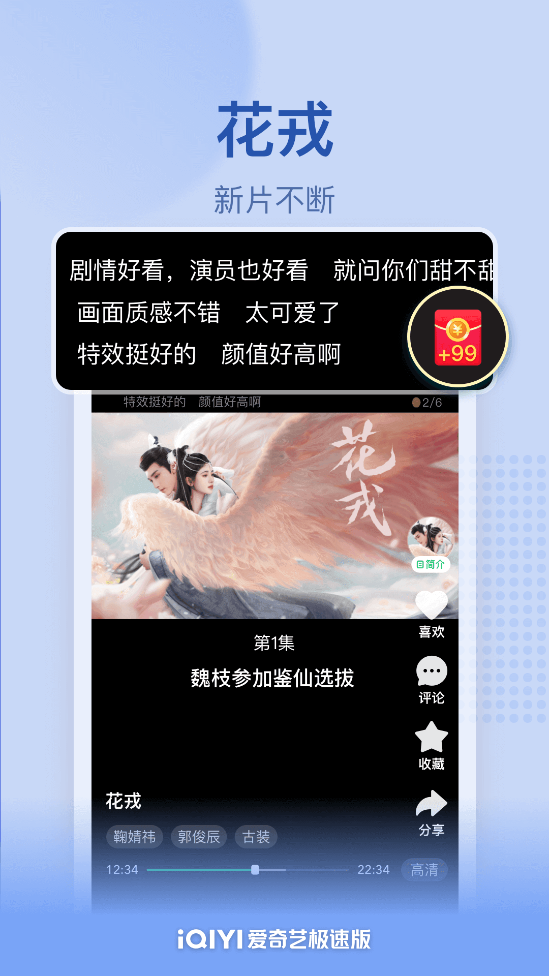 爱奇艺极速版免费版由爱奇艺官方推出,与爱奇艺相比占用内存更小,有全新升级界面UI和更人性化触控反馈,安装速度更快且适配性更好,对搭载旧版本Android系统的手机适配佳,能为更多用户带来优质观影服务,可使用爱奇艺账号登录自由观影,电影、电视剧、动漫番剧、综艺等各类影视内容都能在其中观看 。