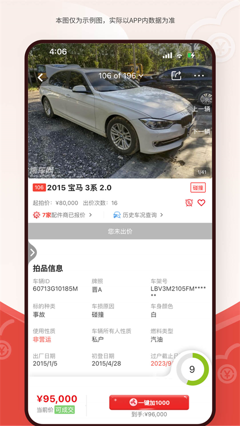 3、监控车辆当前价位,把握二手车市场动态,灵活加价竞拍,赢在起跑线。