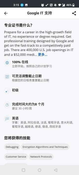 Coursera是一款实用的在线教育软件,为用户提供海量课程目录与丰富课程内容,可直接在软件中观看众多精品讲座和课程,能让用户随时随地学习,且软件内大量课程免费供用户学习,涵盖多种领域和学科,无论你是想提升专业技能、拓宽知识视野,Coursera都能满足你的学习需求,在在线教育领域具有较高的实用性和价值。