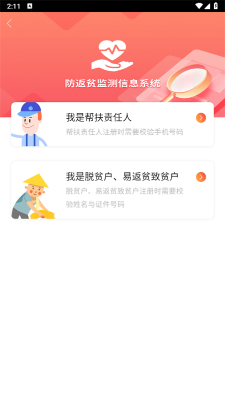 4、进入注册界面后,这里分为两部分,帮扶责任人和脱贫户、易返贫致贫户,我们再根据自己的身份进行相应的选择;