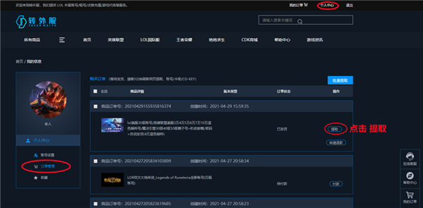 5、购买成功后,请点击网站右上角进入个人中心,在购买订单中查看订单状态。成功付款之后根据页面提示,提取货;