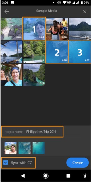 所选剪辑会显示在屏幕底部,完成选择后,键入项目名称,然后点击“创建”以将其导入您的项目