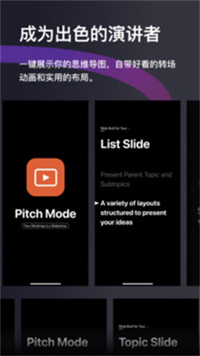 • 演说模式:一键即可以用幻灯片的方式展示你的思维导图,自动生成转场动画和布局,开启演说新体验。
