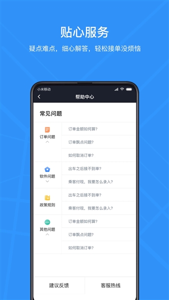 订单,用户、从业人员、财务等信息智能研判、高效管理。试点期间,累计运送乘客15万次,乘客投诉率下降70%,司机的收入增加22.5%,融合出租企业管理成本降低55%;出租车公司的利润增加35%,得到广大乘客、司机、合作企业、主管部门的高度认可。